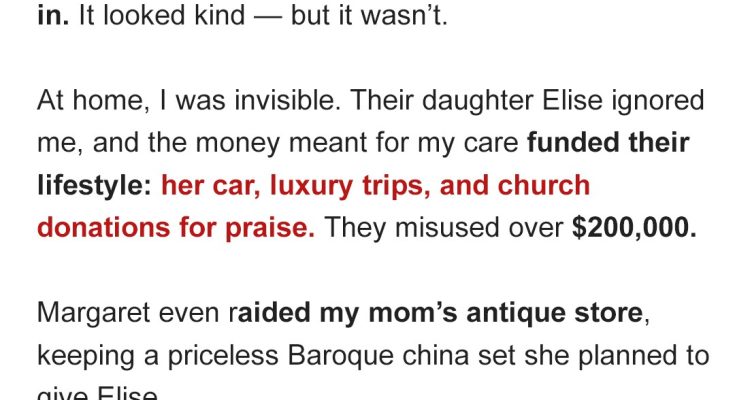 “And her father’s estate finally released the first payment from the trust. It’s more than we expected. This is a blessing. We should put some aside for Elise’s college fund,” Margaret continued. “And buy her some nice clothes. Perhaps get a new car…”