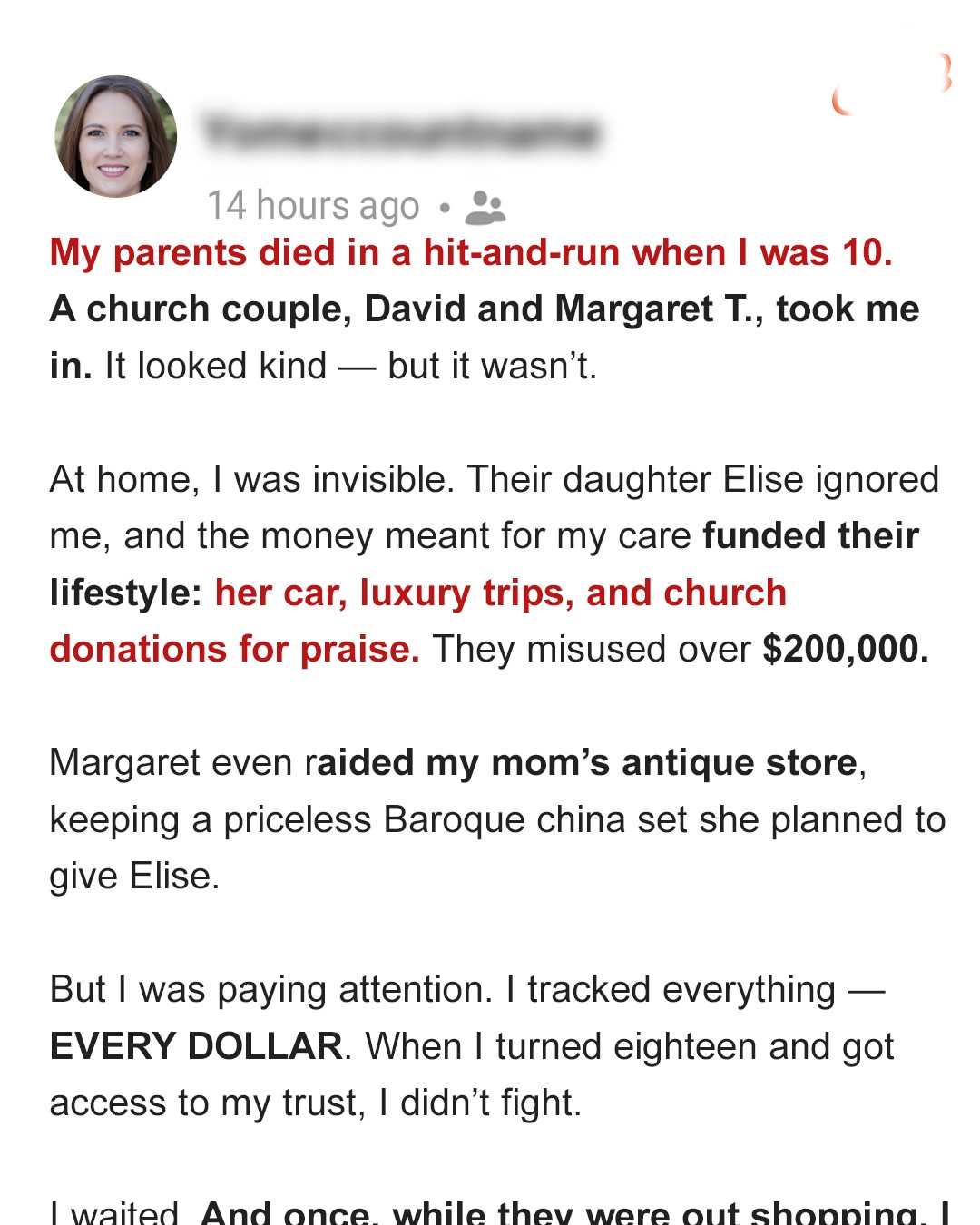 By my 18th birthday, my binder had grown thick with evidence. Spreadsheets showed how over $200,000 of my inheritance had gone toward their lifestyle and reputation.