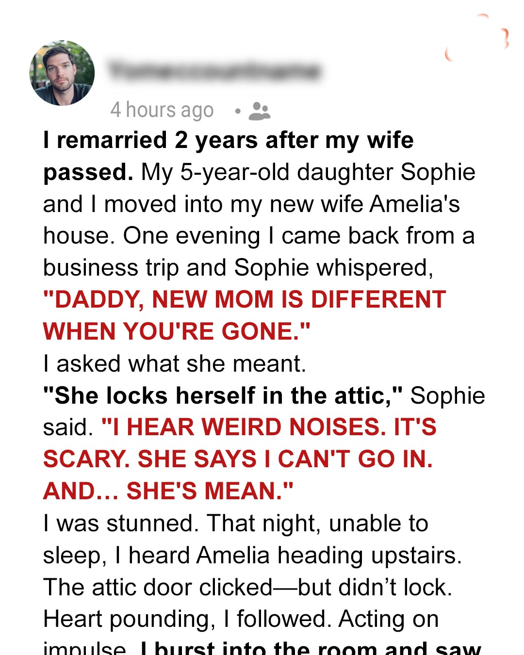 Sophie pulled back, her lower lip quivering. “She locks herself in the attic room. And I hear weird noises when she’s in there. It’s scary, Daddy! And she says I can’t go in that room, and… and she’s mean.”
